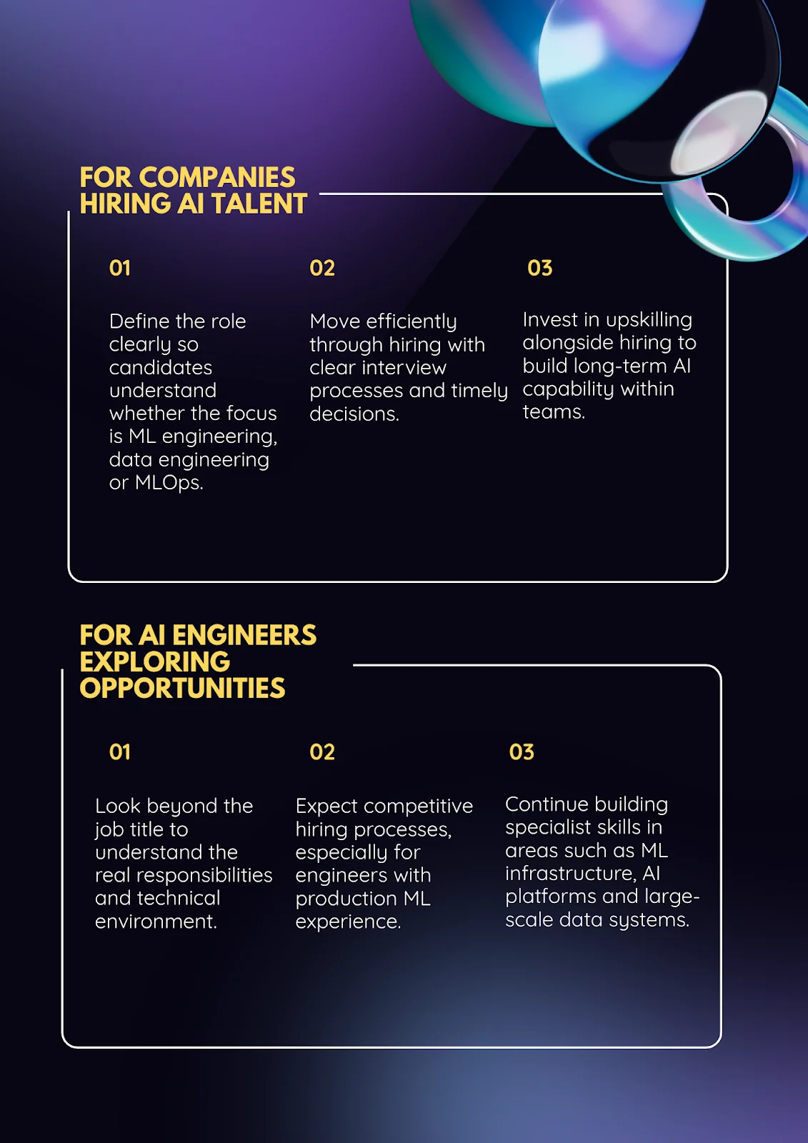 For hiring teams, clarity and speed often make the biggest difference in securing strong candidates. For engineers, understanding the real scope of a role and continuing to build specialist expertise can shape long-term opportunities in the AI market.